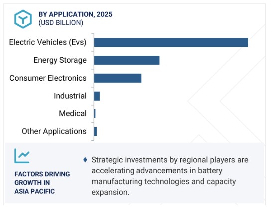 아시아 태평양 지역은 전기차 수요 증가, 배터리 생산 시설에 대한 투자 확대, 정부 지원 정책, 그리고 주요 제조업체들의 강력한 지역적 입지 덕분에 2025년 리튬 이온 배터리 시장에서 가장 큰 점유율을 차지할 것으로 예상됩니다.